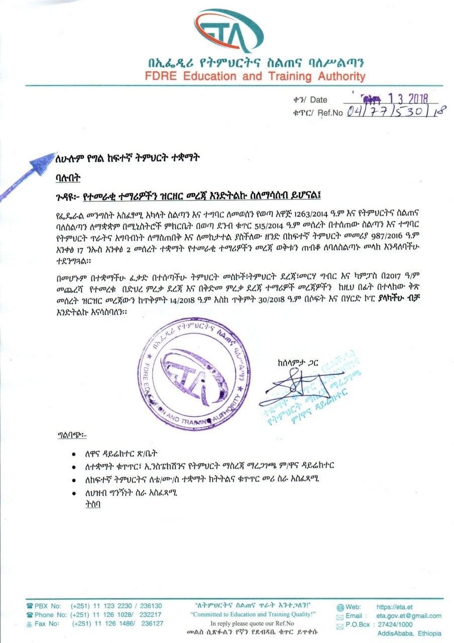 የፌዴራል መንግስት አስፈፃሚ አካላት ስልጣን እና ተግባር ለመወሰን የወጣ አዋጅ 1263/2014 ዓ.ም እና የትምህርትና ስልጠና ባለስልጣን ለማቋቋም በሚኒስትሮች ምክርቤት በወጣ ደንብ ቁጥር 515/2014 ዓ.ም መሰረት በተሰጠው ስልጣን እና ተግባር የትምህርት ጥራትና አግባብነት ለማስጠበቅ እና ለመከታተል ያስችለው ዘንድ በከፍተኛ ትምህርት መመሪያ 987/2016 ዓ.ም አንቀፅ 17 ንኡስ አንቀፅ 2 መሰረት ተቋማት የተመራቂ ተማሪዎችን መረጃ ወቅቱን ጠብቆ ለባለስልጣኑ መላክ እንዳለባችሁ ተደንግጓል፡፡ በመሆኑም በተቋማችሁ ፈቃድ በተሰጣችሁ ትምህርት መስኮች፣ትምህርት ደረጃ፣መርሃ ግብር እና ካምፓስ በ2017 ዓ/ም መጨረሻ የተመረቁ በድህረ ምረቃ ደረጃ እና በቅድመ ምረቃ ደረጃ ተማሪዎች መረጃዎችን ከዚህ በፊት በተላከው ቅጽ መሰረት ዝርዝር መረጃውን ከጥቅምት 14/2018 ዓ.ም እስከ 30/2018 ዓ.ም በሶፍት እና በሃርድ ኮፒ ያላካችሁ ብቻ እንድትልኩ እናሳስባለን፡፡
