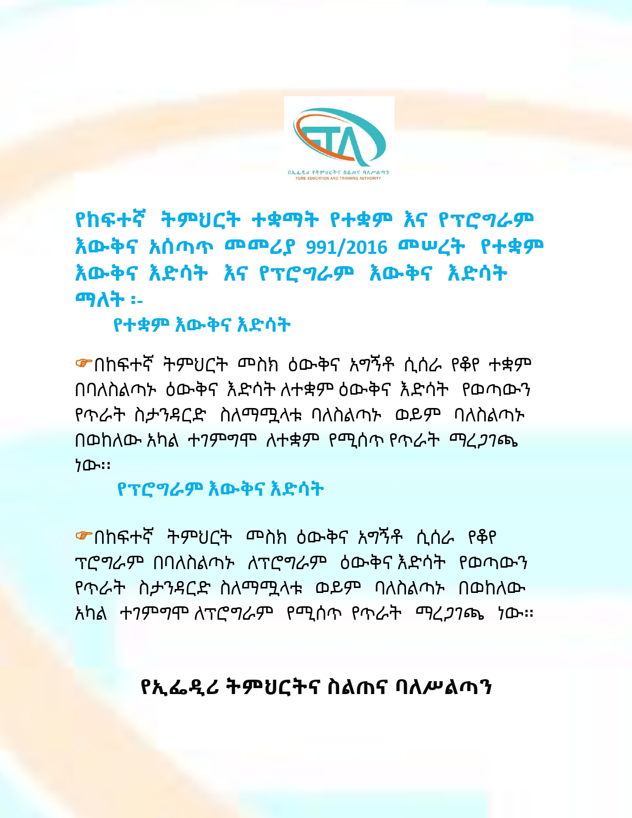 የከፍተኛ ትምህርት ተቋማት የተቋም እና የፕሮግራም እውቅና አሰጣጥ መመሪያ 991/2016 መሠረት የተቋም እውቅና እድሳት እና የፕሮግራም እውቅና እድሳት ማለት ፡- የተቋም እውቅና እድሳት ** በከፍተኛ ትምህርት መስክ ዕውቅና አግኝቶ ሲሰራ የቆየ ተቋም በባለስልጣኑ ዕውቅና እድሳት ለተቋም ዕውቅና እድሳት የወጣውን የጥራት ስታንዳርድ ስለማሟላቱ ባለስልጣኑ ወይም ባለስልጣኑ በወከለው አካል ተገምግሞ ለተቋም የሚሰጥ የጥራት ማረጋገጫ ነው፡፡ የፕሮግራም እውቅና እድሳት ** በከፍተኛ ትምህርት መስክ ዕውቅና አግኝቶ ሲሰራ የቆየ ፕሮግራም በባለስልጣኑ ለፕሮግራም ዕውቅና እድሳት የወጣውን የጥራት ስታንዳርድ ስለማሟላቱ ወይም ባለስልጣኑ በወከለው አካል ተገምግሞ ለፕሮግራም የሚሰጥ የጥራት ማረጋገጫ ነው፡፡ የኢፌዲሪ ትምህርትና ስልጠና ባለሥልጣን በፊስቡክ -https://www.facebook.com/FDRE.ETA በትዊተር- https://twitter.com/FDRE_ETA በቴሌግራም -https://t.me/FDRE_ETA በዌብሳይት Www. neta.gov.et ይከታተሉ::