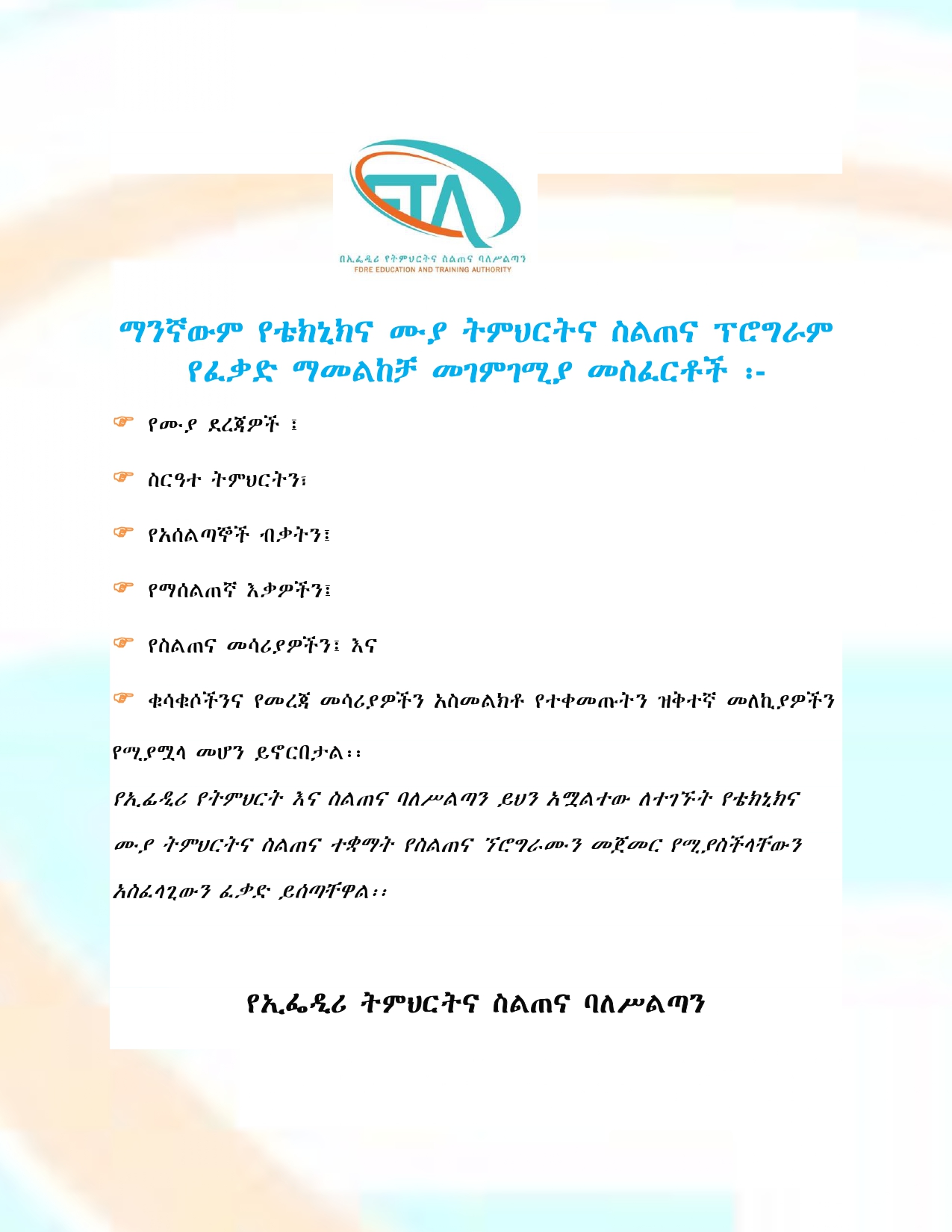 ማንኛውም የቴክኒክና ሙያ ትምህርትና ስልጠና ፕሮግራም የፈቃድ ማመልከቻ መገምገሚያ መስፈርቶች፡- ** የሙያ ደረጃዎች ፤ ** ስርዓተ ትምህርትን፣ ** የአሰልጣኞች ብቃትን፤ ** የማሰልጠኛ እቃዎችን፤ ** የስልጠና መሳሪያዎችን፤ እና ** ቁሳቁሶችንና የመረጃ መሳሪያዎችን አስመልክቶ የተቀመጡትን ዝቅተኛ መለኪያዎችን የሚያሟላ መሆን ይኖርበታል፡፡ የኢፊዲሪ የትምህርት እና ስልጠና ባለሥልጣን ይህን አሟልተው ለተገኙት የቴክኒክና ሙያ ትምህርትና ስልጠና ተቋማት የስልጠና ኘሮግራሙን መጀመር የሚያስችላቸውን አስፈላጊውን ፈቃድ ይሰጣቸዋል፡፡ የኢፌዲሪ ትምህርትና ስልጠና ባለሥልጣን በፊስቡክ -https://www.facebook.com/FDRE.ETA በትዊተር- https://twitter.com/FDRE_ETA በቴሌግራም -https://t.me/FDRE_ETA በዌብሳይት Www. neta.gov.et ይከታተሉ::