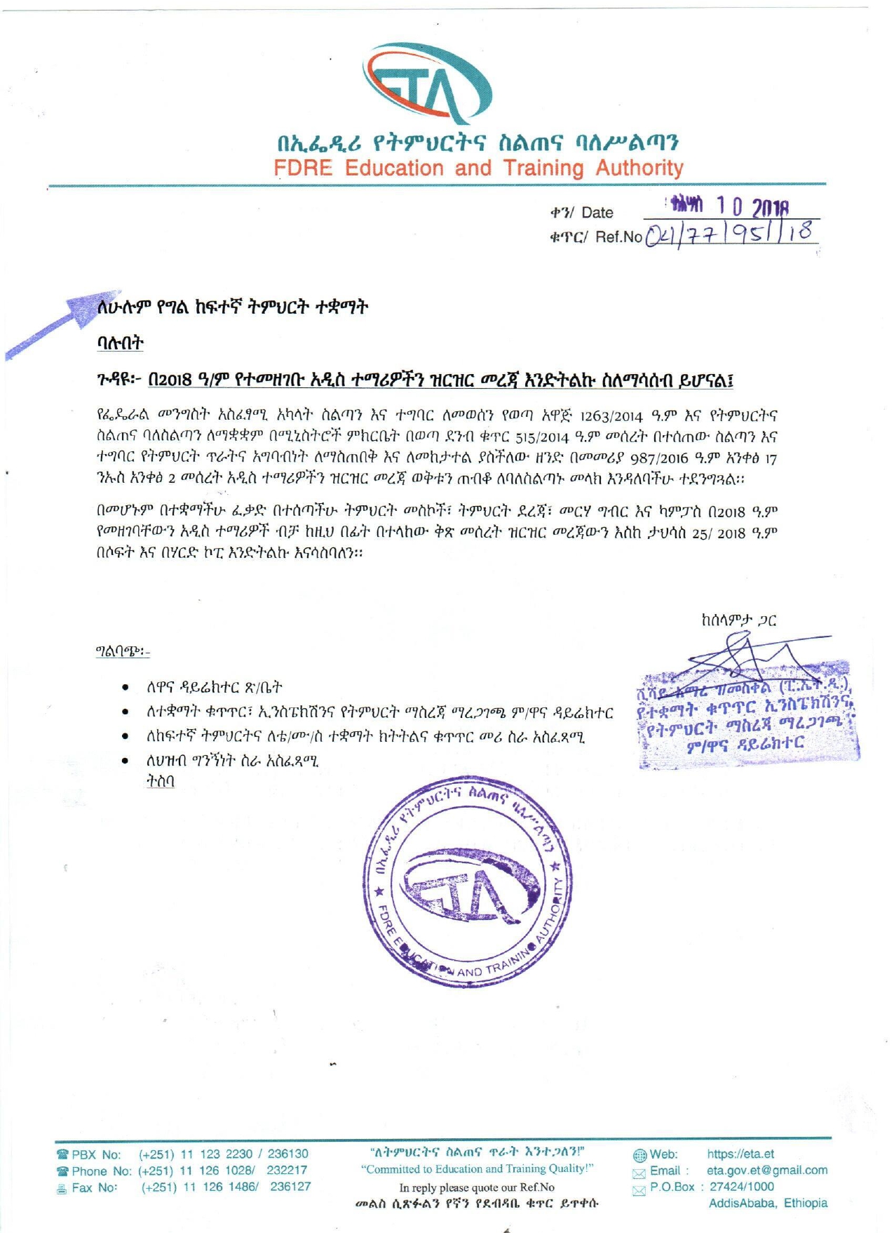 #ማሳሰቢያ ለሁሉም የግል ከፍተኛ ትምህርት ተቋማት ባሉበት ------- ጉዳዩ፦ በ2018 ዓ/ም የተመዘገቡ አዲስ ተማሪዎችን ዝርዝር መረጃ እንድትልኩ ስለማሳሰብ ይሆናል፤ -------------------------------------------------------------------------------------------- የፌዴራል መንግስት አስፈፃሚ አካላት ስልጣን እና ተግባር ለመወሰን የወጣ አዋጅ 1263/2014 ዓ.ም እና የትምህርትና ስልጠና ባለስልጣን ለማቋቋም በሚኒስትሮች ምክርቤት በወጣ ደንብ ቁጥር 515/2014 ዓ.ም መሰረት በተሰጠው ስልጣን እና ተግባር የትምህርት ጥራትና አግባብነት ለማስጠበቅ እና ለመከታተል ያስችለው ዘንድ በመመሪያ 987/2016 ዓ.ም አንቀፅ 17 ንኡስ አንቀፅ 2 መሰረት አዲስ ተማሪዎችን ዝርዝር መረጃ ወቅቱን ጠብቆ ለባለስልጣኑ መላክ እንዳለባችሁ ተደንግጓል፡፡ በመሆኑም በተቋማችሁ ፈቃድ በተሰጣችሁ ትምህርት መስኮች፣ ትምህርት ደረጃ፣ መርሃ ግብር እና ካምፓስ በ2018 ዓ.ም የመዘገባቸውን አዲስ ተማሪዎች ብቻ ከዚህ በፊት በተላከው ቅጽ መሰረት ዝርዝር መረጃውን እስከ ታህሳስ 25/ 2018 ዓ.ም በሶፍት እና በሃርድ ኮፒ እንድትልኩ እናሳስባለን፡፡